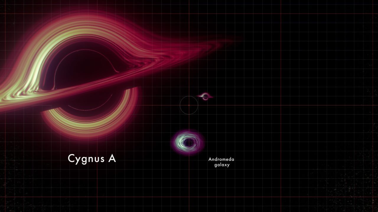 10個の超大質量ブラックホールと太陽系のサイズが比較です。